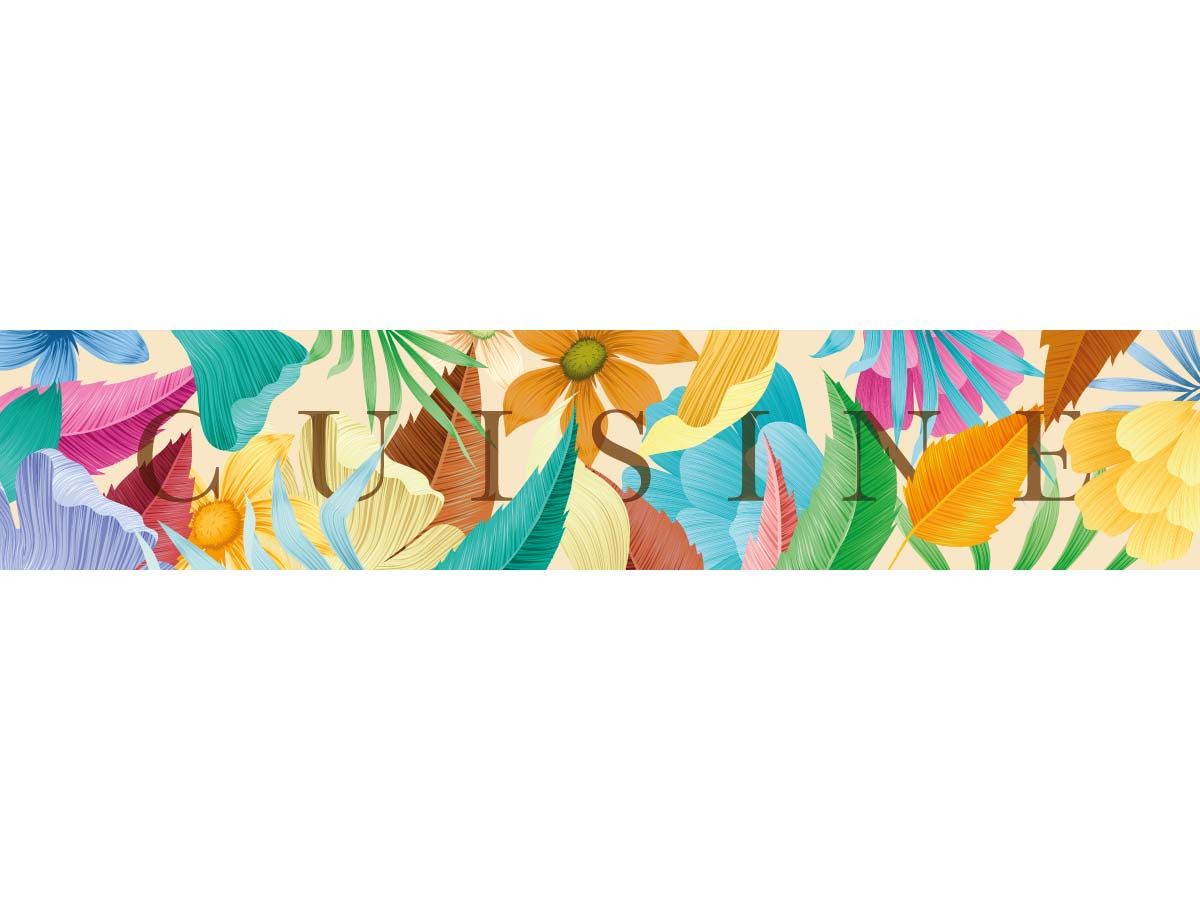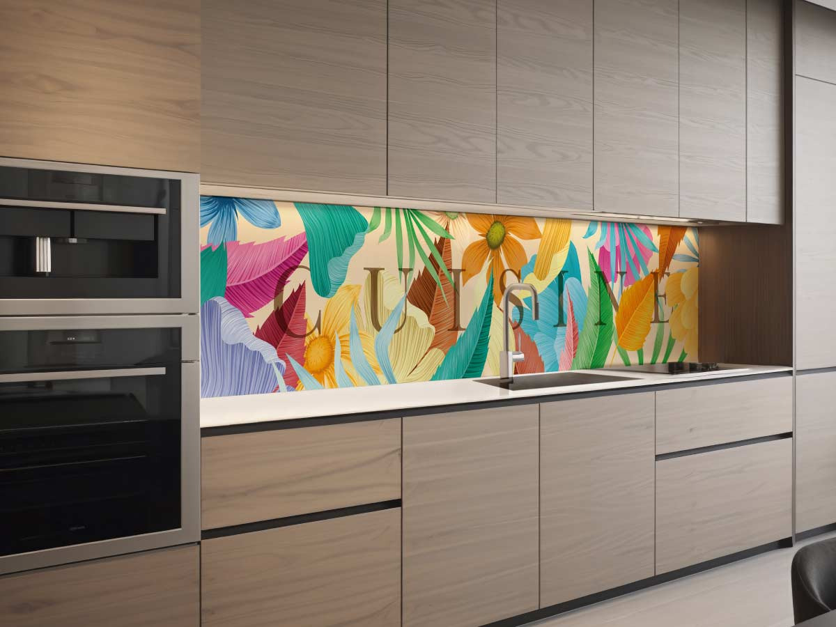 Crédence Cuisine Florale Printanière Jaune. Les fleurs et les feuilles aux teintes jaune, marron, bleu, et rose dans un style printanier apportent une touche de fraîcheur et de gaieté à votre intérieur.