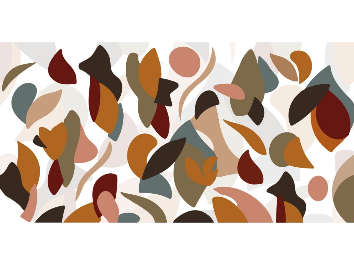 Motifs : formes abstraites et organiques Couleurs : jaune / orangé, vert, terracotta, kaki, rose, bleu gris