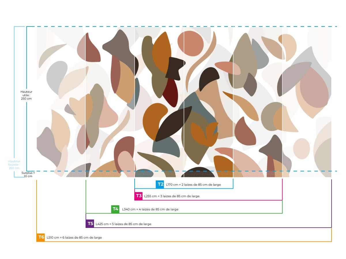 Commander le nombre exact de lés de papier peint panoramique est crucial : en commander trop est du gaspillage, alors qu'un manque risque d'engendrer une différence de couleur sur les lés supplémentaires Alors pour ça, rien de plus simple ! Munissez vous d'un mètre afin de mesurer la hauteur et la largeur de vos murs. Faites attention à ne pas compter les plinthes ou les moulures dans vos mesures. Et choisissez le nombre de lès correspondant à vos murs !