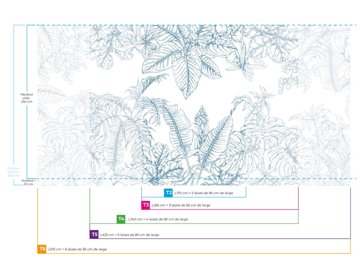 Commander le nombre exact de lés de papier peint panoramique est crucial : en commander trop est du gaspillage, alors qu'un manque risque d'engendrer une différence de couleur sur les lés supplémentaires Alors pour ça, rien de plus simple ! Munissez vous d'un mètre afin de mesurer la hauteur et la largeur de vos murs. Faites attention à ne pas compter les plinthes ou les moulures dans vos mesures. Et choisissez le nombre de lès correspondant à vos murs !