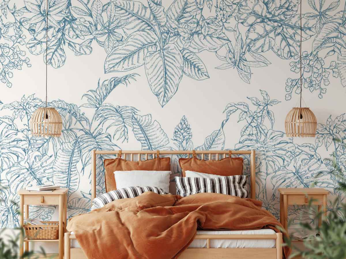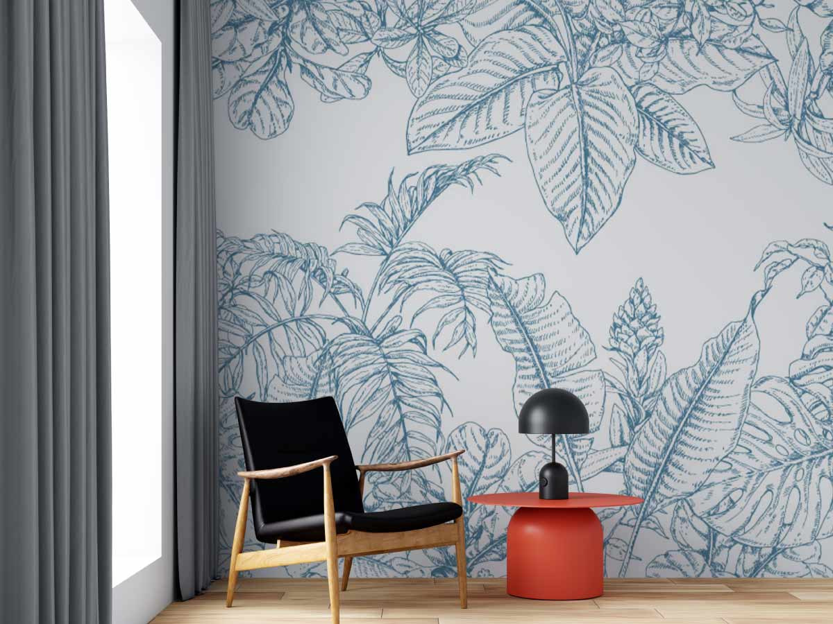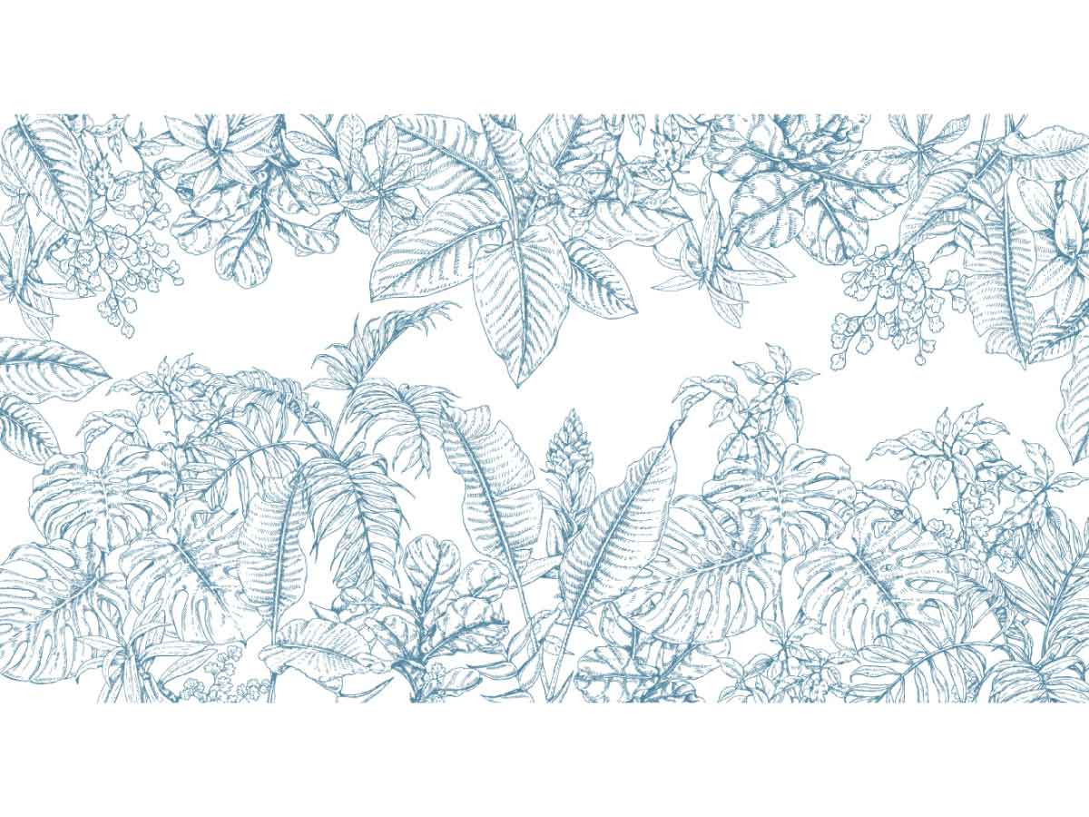 Transformez votre espace en un paradis tropical avec notre Papier Peint Panoramique - Jungle Tropicale. Les feuilles tropicales dessinées au trait, dans des nuances de blanc et vert-bleu, créent une atmosphère rafraîchissante et contemporaine.