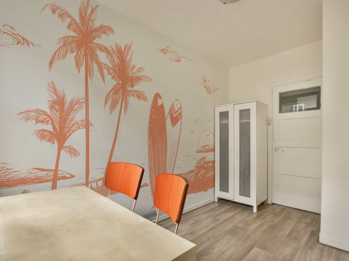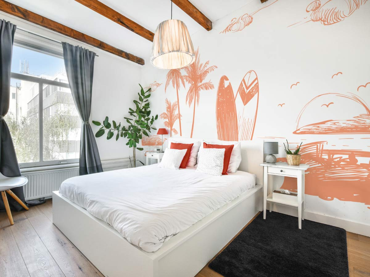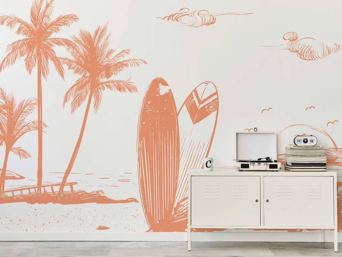 Évadez-vous vers une plage ensoleillée avec ce magnifique papier peint panoramique représentant une scène de plage avec des palmiers et une planche de surf corail. Ce design simple et apaisant, utilisant des teintes douces, crée une ambiance de vacances et de détente. Parfait pour les salons, les chambres ou les espaces de loisirs, ce papier peint est idéal pour ceux qui souhaitent apporter une touche de l'esprit de la plage et du surf à leur décoration intérieure.
