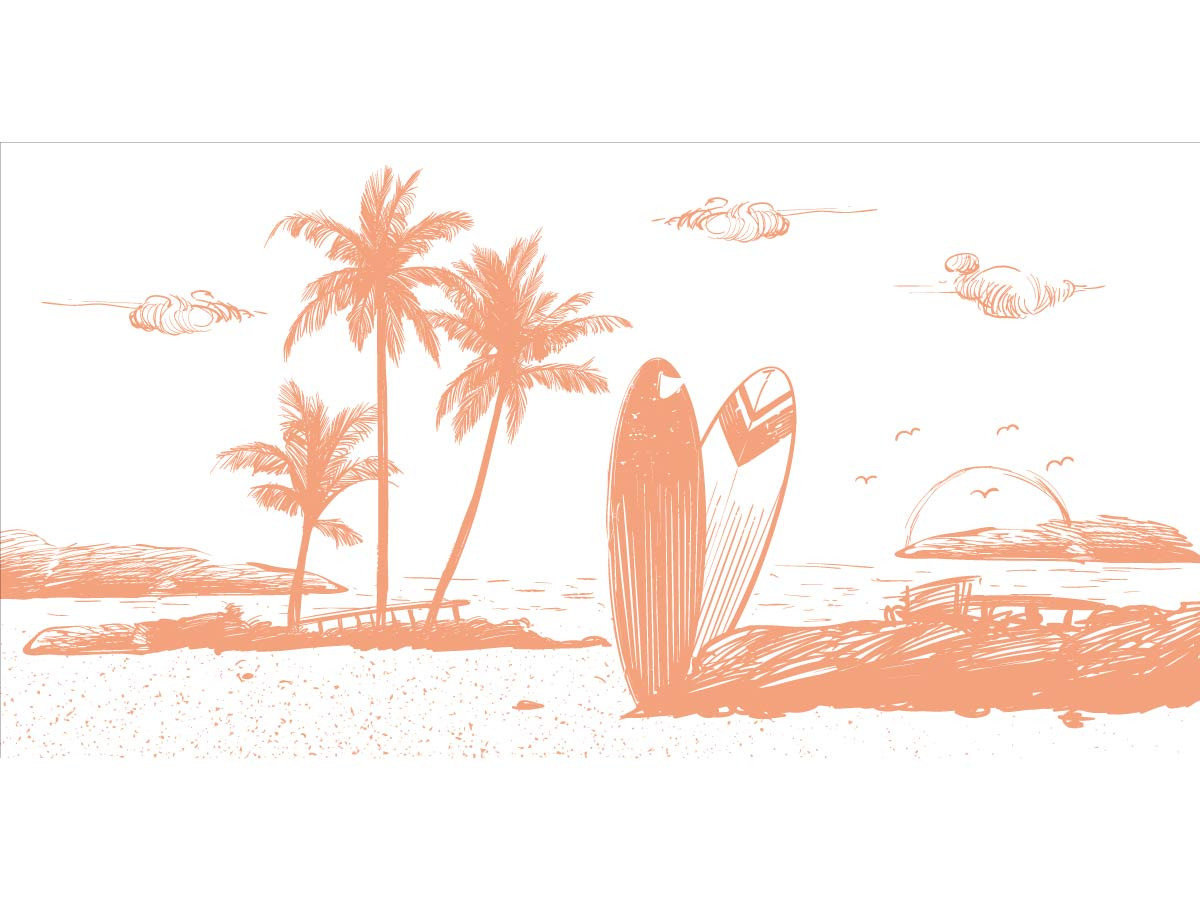 motifs : gravure, dessin au trait, palmier, plage, planche de surf couleurs : corail