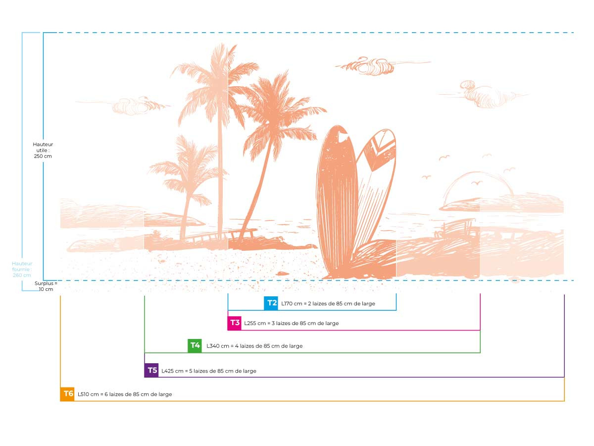 Commander le nombre exact de lés de papier peint panoramique est crucial : en commander trop est du gaspillage, alors qu'un manque risque d'engendrer une différence de couleur sur les lés supplémentaires Alors pour ça, rien de plus simple ! Munissez vous d'un mètre afin de mesurer la hauteur et la largeur de vos murs. Faites attention à ne pas compter les plinthes ou les moulures dans vos mesures. Et choisissez le nombre de lès correspondant à vos murs !