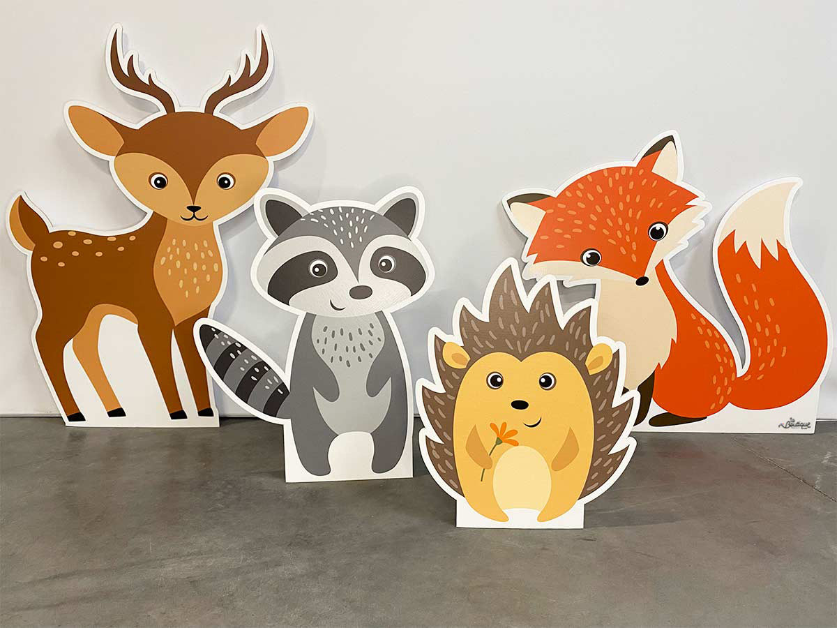 Ce kit est composé de quatre décorations en carton grand format : un renard, un hérisson, un cerf et un raton laveur en carton.
